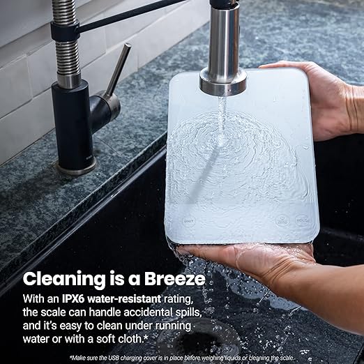 - ๐ช๐ฎ๐๐ฒ๐ฟ-๐ฅ๐ฒ๐๐ถ๐๐๐ฎ๐ป๐ ๐๐ฒ๐๐ถ๐ด๐ป: The scale features an IPX6 water-resistant design, allowing you to easily measure liquids and wipe the scale clean