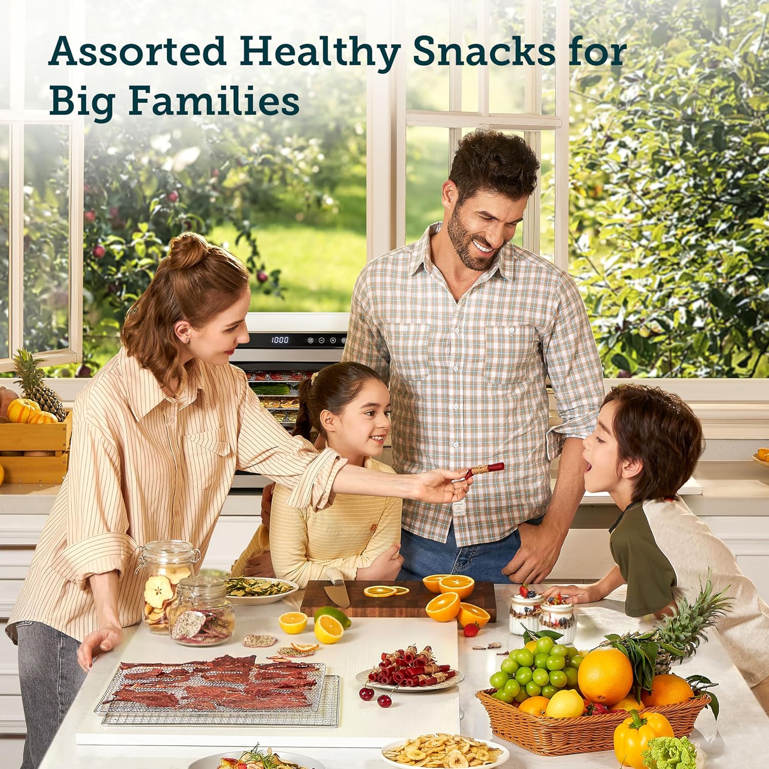 - 𝐅𝐀𝐌𝐈𝐋𝐘-𝐅𝐑𝐈𝐄𝐍𝐃𝐋𝐘 𝐒𝐍𝐀𝐂𝐊𝐒: Create an array of healthy homemade snacks like dried fruits, veggies, and jerky, preserving 𝟵𝟮% 𝙤𝙛 𝙥𝙧𝙤𝙩𝙚𝙞𝙣. Perfect for large families. A rear fan ensures even dehydration, no over-drying or moisture issues