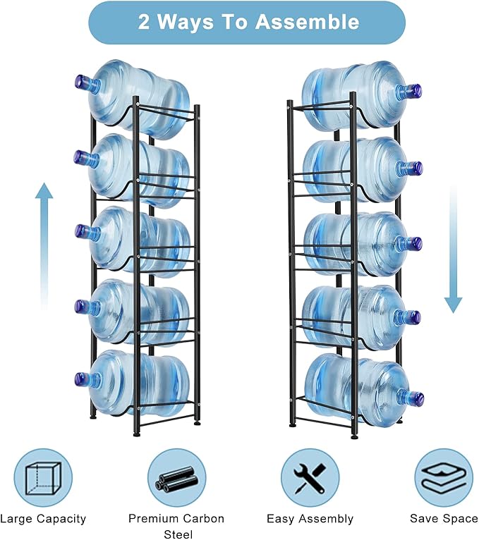 - 【 Easy to Assemble & Detach】Comes with all the hardware tools you need and an easy-to-follow manual, you can assemble and disassemble this water rack for 5 gallon jug as a 3/4/5 tier according to your storage needs and space availability.