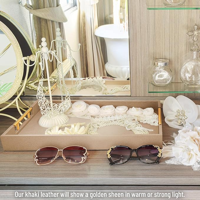 17" x 12" Wood Serving Tray with Gold Polished Metal Handles, Home Decorative Wooden Rectangle Ottoman Leather Decor Platter Bathroom Vanity Tray for All Occasions Khaki