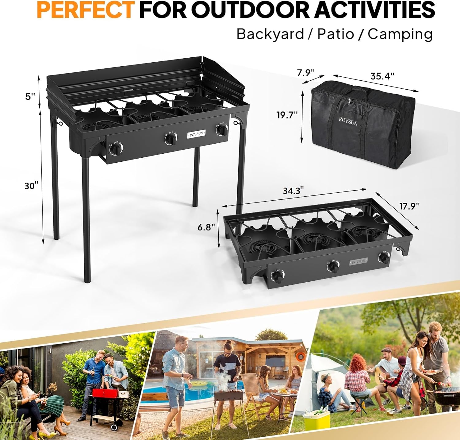 - 225,000 BTU ★ Stove give off a strong flame that can be adjusted easily. Heat is controlled by a CSA approved regulator, which is more safety and longer working time. Three burner make it possible to cook more food at the same time, 75,000 BTU for each burner.