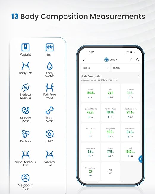 - Track your progress: This smart scale provides 13 essential body composition metrics, including body weight, body fat percentage, BMI, muscle mass, and bone mass. Simply step on the scale to get an instant reading, or sync it with the Renpho Health App to monitor and record your fitness journey over time