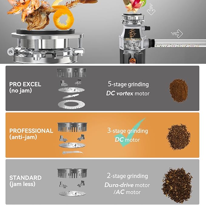 - Turbocharging: The Turbocharging Technology can discharge grinded waste quickly and strongly,preventing pipe clogging and extending the life of the disposals.