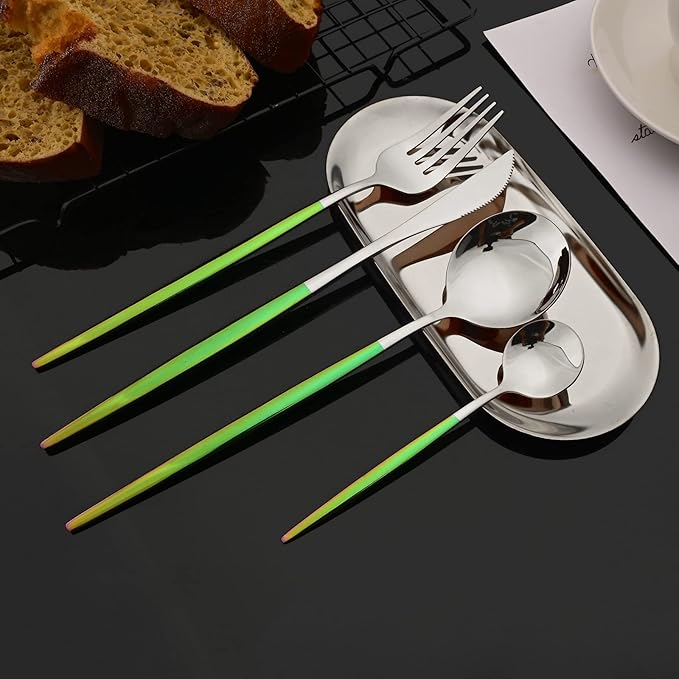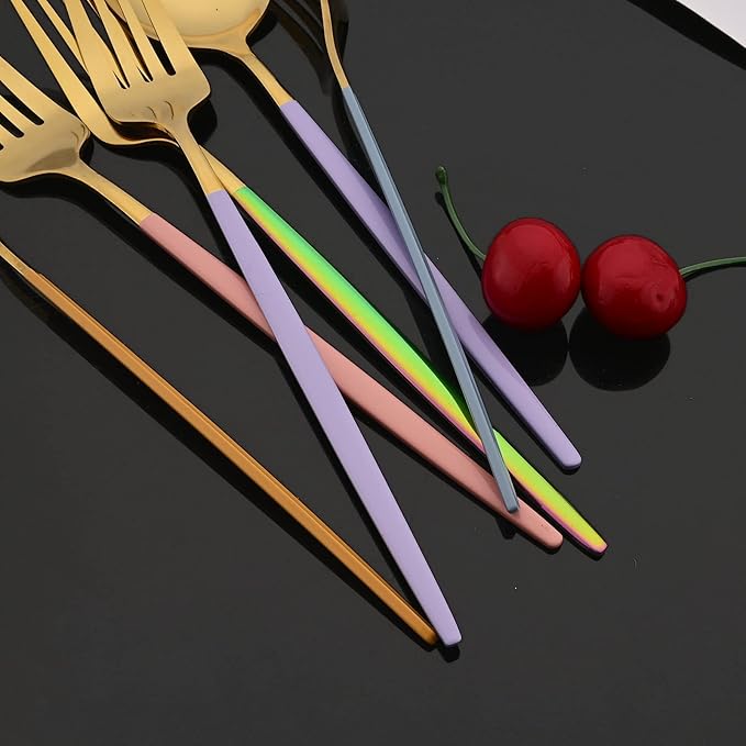 JASHII Flatware Set 24 Piece, Stainless Steel Silverware Set, Macaron Small Fresh Color Cutlery Set, Modern Elegant Tableware Set for Party, Christmas, Dinner (Rainbow Silver)