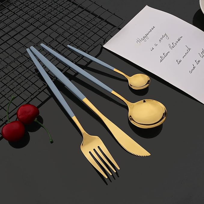 JASHII Flatware Set 24 Piece, Stainless Steel Silverware Set, Macaron Small Fresh Color Cutlery Set, Modern Elegant Tableware Set for Party, Christmas, Dinner (Haze Blue Gold)