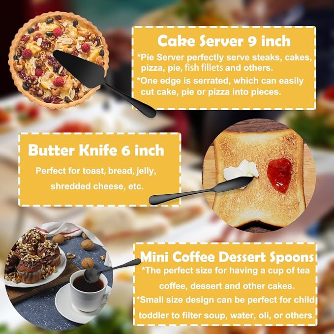 - 【Multiple Applications】The practical 9 inch tongs are capable of flipping breads burgers or fish, grilling meat or as salad tongs. The other 6 inch small tongs are suitable for serving sugar cube, ice cube, jelly, etc. The slotted spoons, solid spoons and forks can removed different food in the liquid or with a thick sauce. Pie Server perfectly serve steaks, pizza, pie and others. The butter knife and small spoons are great for breakfast, high tea with toast and coffee.