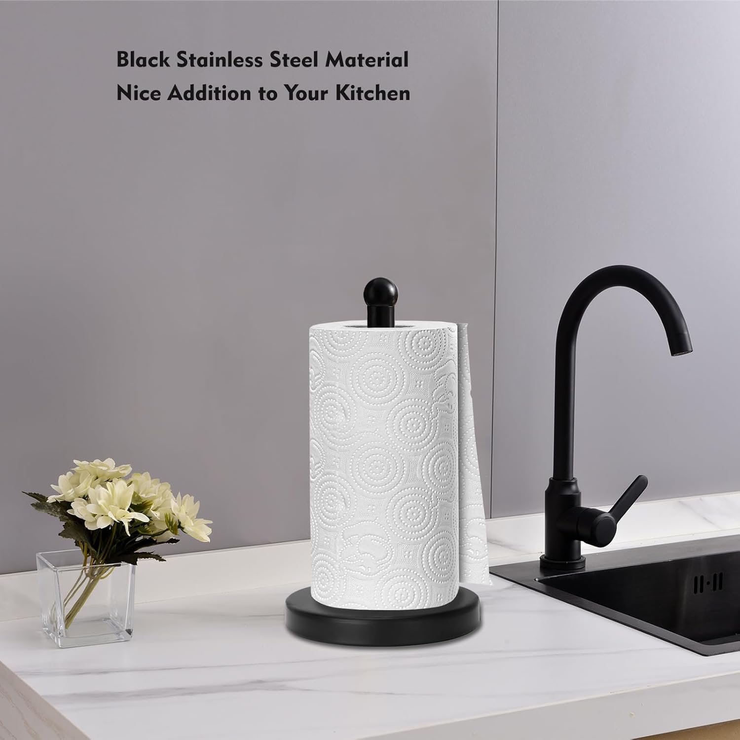 - Elegant Looking in Black Color. With an elegant black matte finish, paper towel holder looks attractive on your countertop. This free standing paper towel holder will definitely bring additional décor for your home.