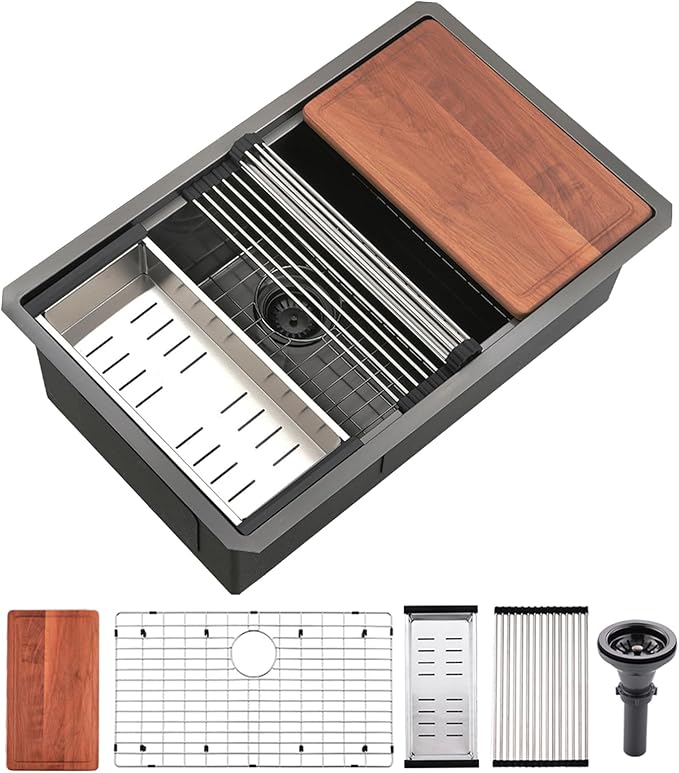 - Workstation Undermount Sink Design: The workstation sink with single track - ledges on the front and back provide a track for sliding the built-in accessories, include placement of solid wood cutting board, stainless steel colander and roll-up dish drying rack, saving more workspace