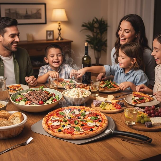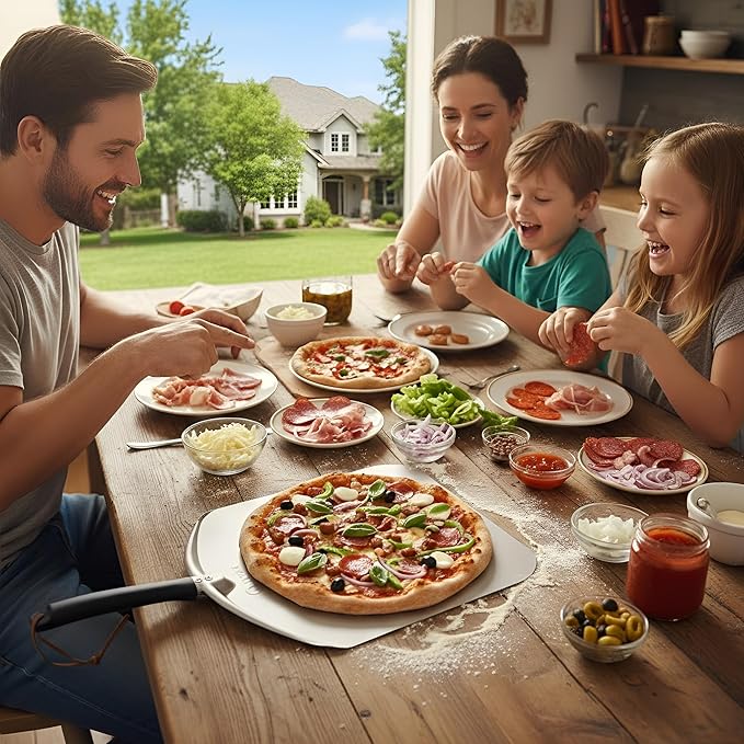 - 【LIGHTWEIGHT & EASY TO USE】 Made of aluminum, it's thin and lightweight, simply sprinkle your pizza peel metal surface with a little corn flour for a non stick surface, you can slide your pizza off of your spatula and onto your plate without any stress.