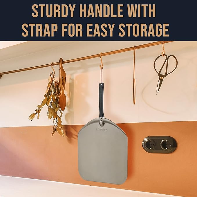 - 【STURDY HANDLE WITH LANYARD FOR EASY STORAGE】 With a lanyard on the handle, the pizza peel can be hung on the wall or any other place with a hook.Detachable design for extremely easy storage, Fit in any corner of any kitchen, gourmet pizza parlor and bakery.