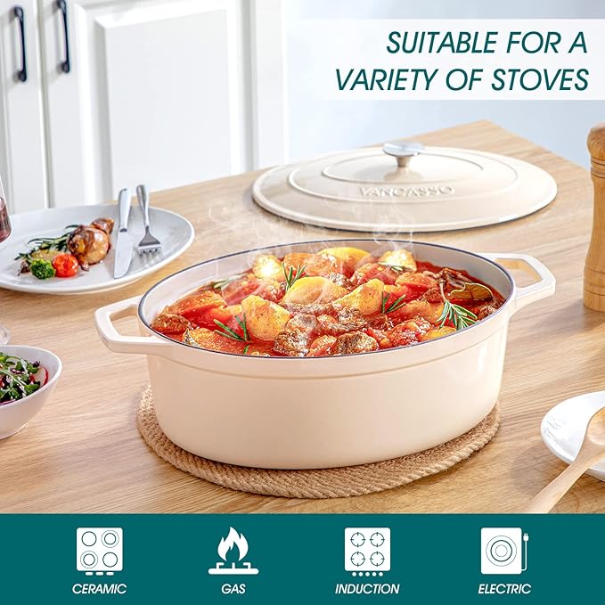 - 【One Pot For Multiple Use - Suitable For Larger Food】This 9.3-Quart vancasso enameled cast iron dutch oven is excellent for Larger food. It is resistant to acidic and alkaline substances, and you can use it to marinate food before cooking (prepare, cook, and serve food in the same pot). Safe for braising, simmering, baking, broiling, and roasting on gas, electric, ceramic, glass top, and induction stoves (not including microwave ovens); oven safe to 500°F.