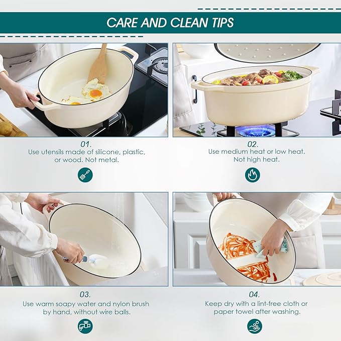 - 【French Traditional Craft】The vancasso cast iron dutch oven uses the traditional French process of pouring and forging liquid cast iron as a whole, without splicing, and not easy to break. After spraying 3 layers of enamel coating inside and outside, it is heated at 1500°F for 30 minutes. The cream-colored interior makes it easier to see the state of your food, while the classic light blue color will brighten up your kitchen.