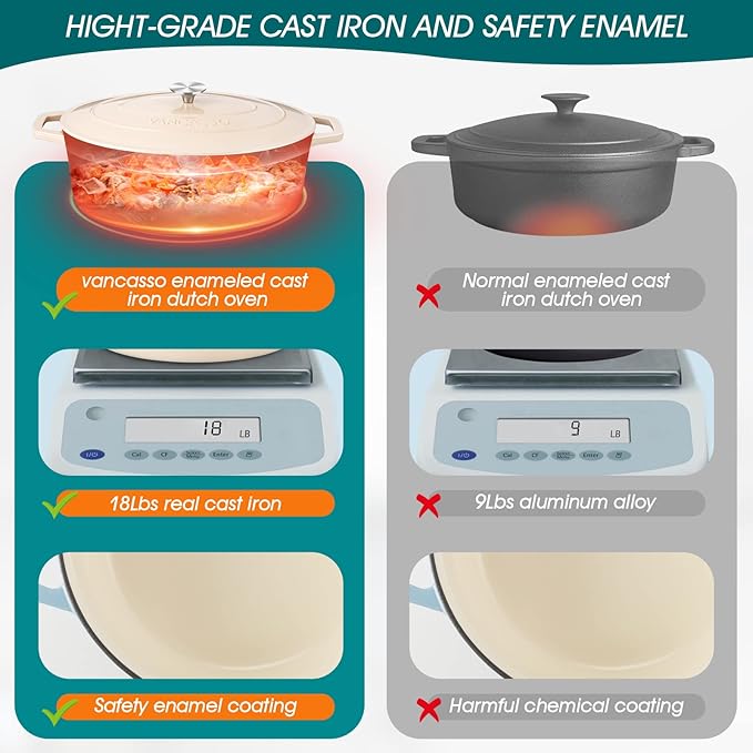 - 【18Lbs Real Cast Iron】The vancasso cast iron dutch oven pot's body is made of high-purity ore, with uniform thickness and even heat distribution. The heat retention is excellent, keeping food warm even when away from the heating source for a long time. There's no need to worry about food getting cold while waiting for family and friends to arrive. Be sure to use an oven mitt or pot holder when holding the Dutch oven; the handles can get very hot.