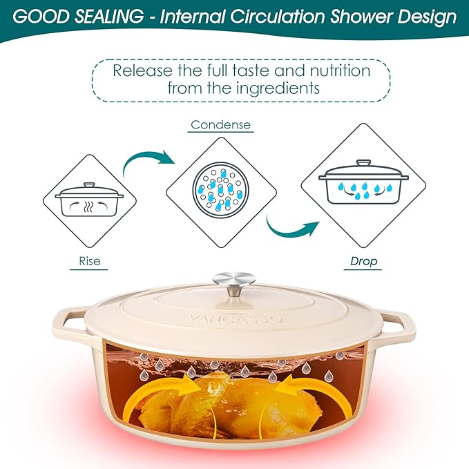 - 【Internal Circulation Shower Design】The 40 evenly distributed dots on the lid accelerate the condensation of evaporated water vapor and drip it evenly into the food. In contrast, other water vapor flows smoothly back into the cast iron pot because of the specific curvature design. The water vapor circulates and locks inside the dutch oven, fully releasing the flavor and nutrients of the ingredients.