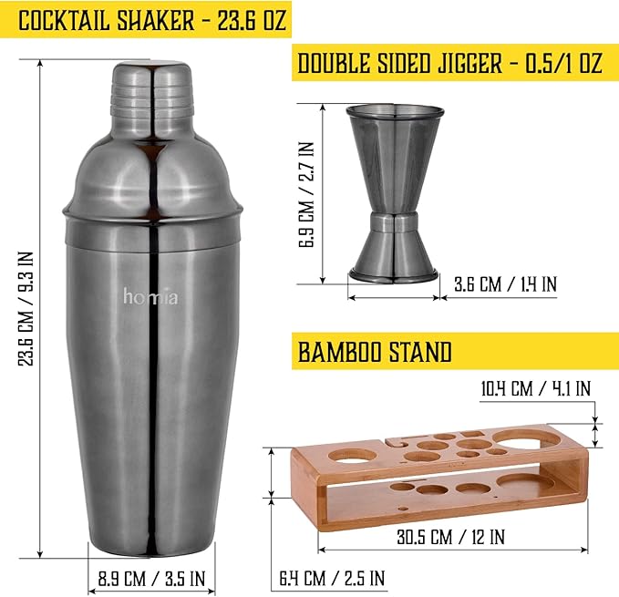 - PREMIUM QUALITY AND COMFORTABLE SIZES: The best thing about this stainless steel cocktail shaker is that it's durable, leak-proof, and lightweight! You won't have to worry about any rust or scratches on your new favorite tool, too. The sleek wooden base and stylish design of the set will fit into any setting, and the compact size means it won't take up too much space. Dimensions: Shaker 3.5x9.3" (23.6 Oz), double jigger 1.4x2.7" (0.5/1 Oz) and Cocktail Smoker, 4.5" in diameter.
