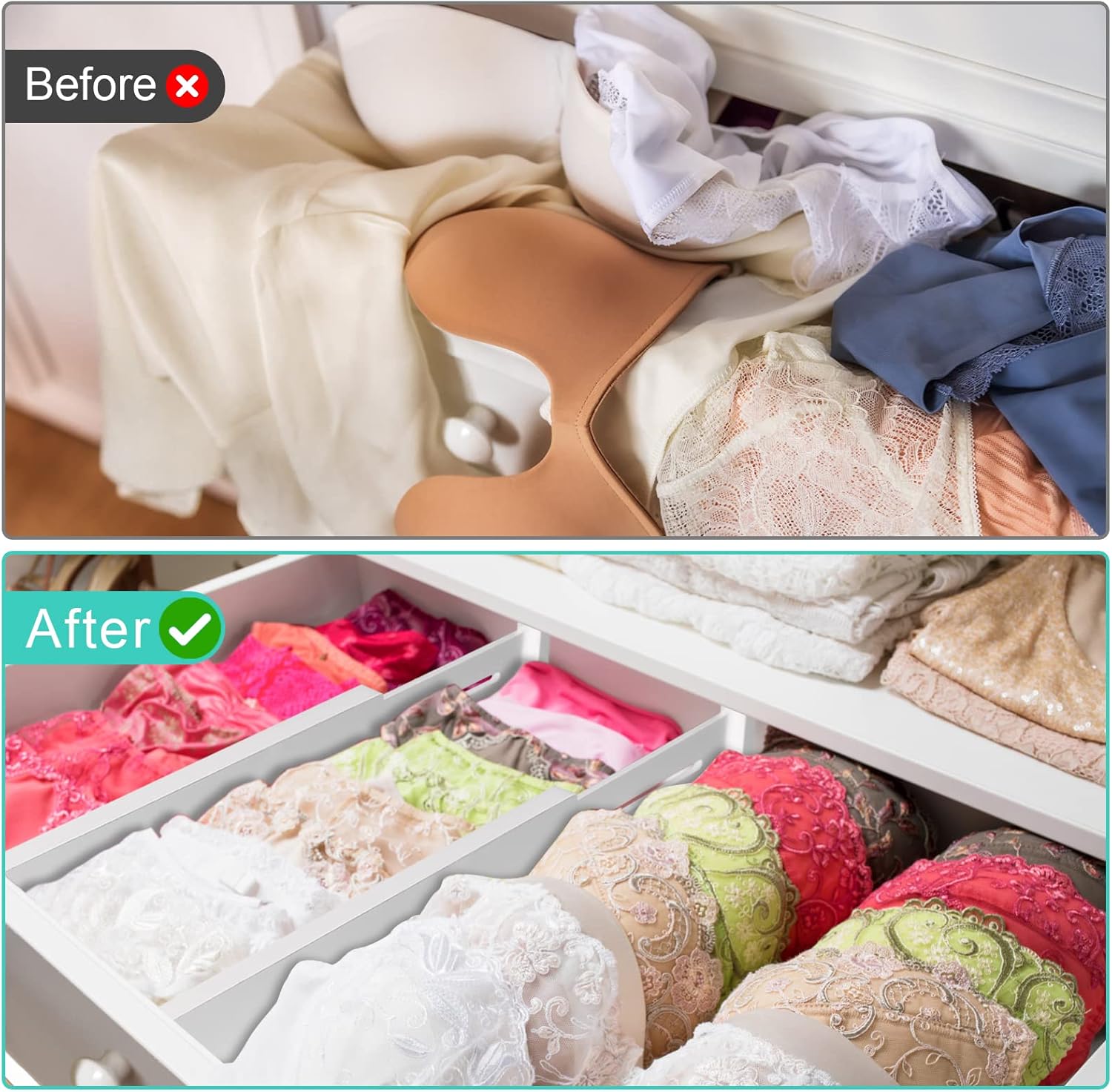 - ARE YOU TIRED OF MESSY & OVERCROWDED DRAWERS? Drawer Dividers are the perfect solution to organize any drawer in your home, from the kitchen to the bedroom. It is remarkable how such a small investment into organizing your drawer space makes a BIG difference allowing each item to have it’s place