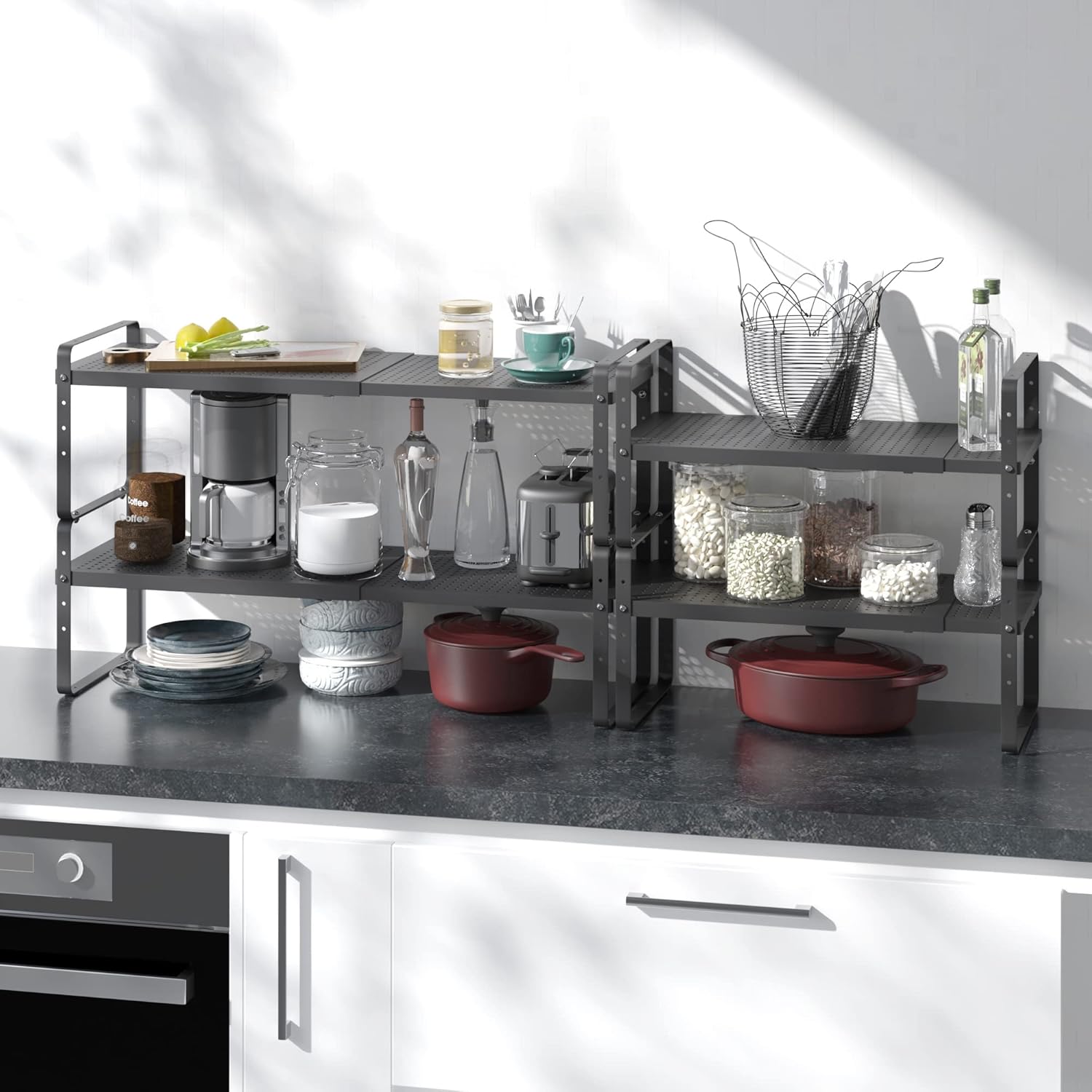 - Expandable &Stackable Cabinet Shelf Organizer: The width and height of the expandable kitchen cabinet shelves can be adjusted according to your needs, which is a very practical storage shelf. The dimensions before expansion are 16.5 "L x 10.2" W x 9.6 "H. Its length can be extended from 16.5" to 27". You can also stack the 2pack shelves together to form a two-layer storage space. Or it can be used as 2 single shelves separately