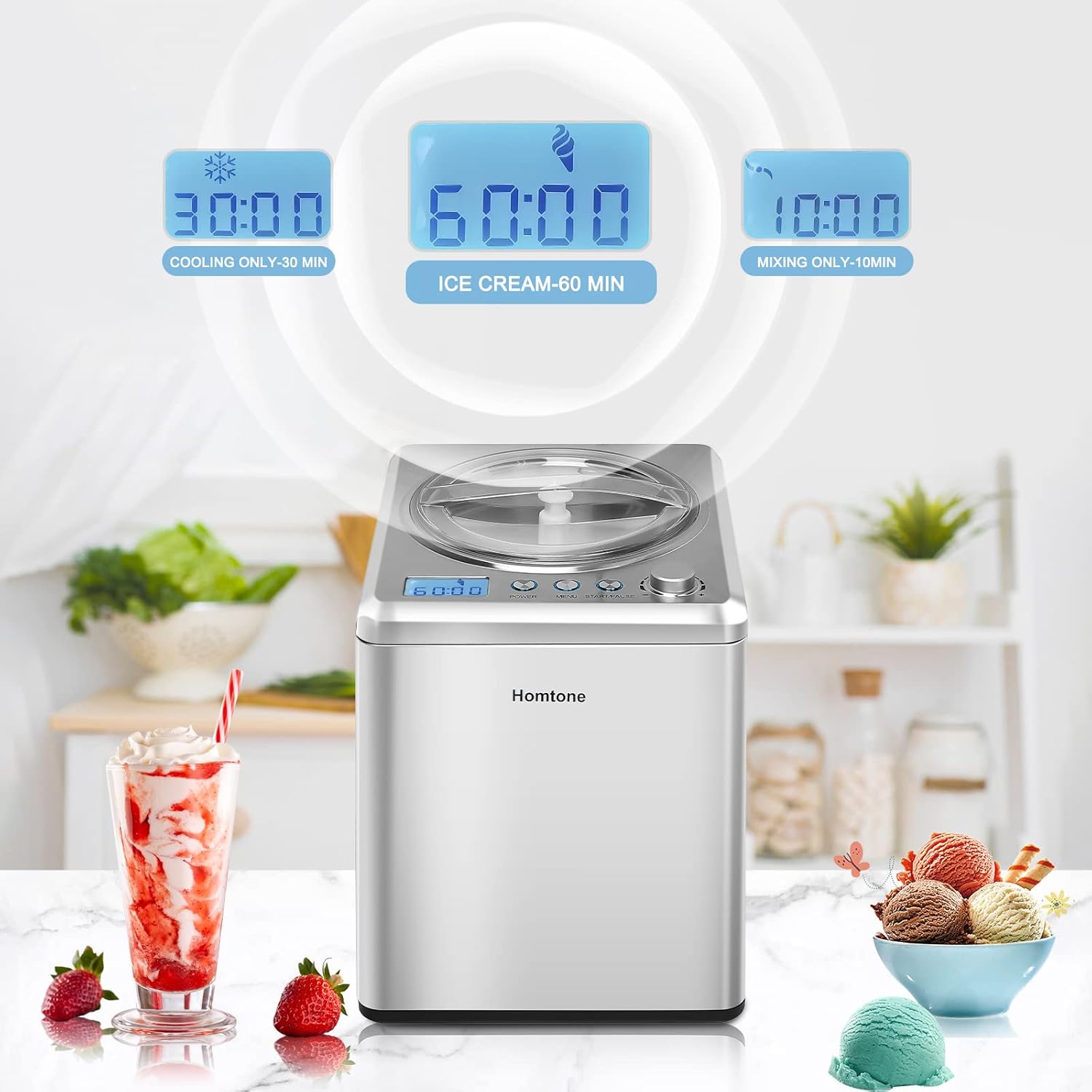 - ăOne-Button Operation, Enjoy Delicious EasilyăďźThe Homtone ice cream maker comes with an intuitive LCD screen, simple buttons and auto-shut-off function. Just add the ingredients, lock the lid and press the button. No pre-freezing of ingredients is needed, and the process is fully automatic. The digital display monitors progress in real time, and an alarm reminds you when itâs done. Itâs easy for both newbies and professionals to use.