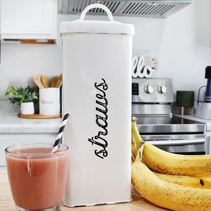 AuldHome Design Farmhouse Enamelware Straw Holder (White); Rustic Metal Straw Storage Canister