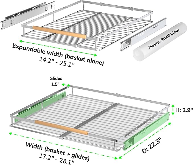 - EXPANDABLE DESIGN: This pull out cabitnet shelf is designed to fit in most cabinets. The width of the wire basket can be adjusted from 17.2“ to 28.1”. The new expandable design gives you a better experience and saves your space