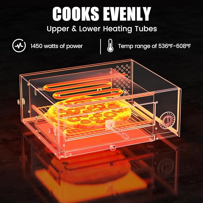 - π[ More Quick Heating]πWith 1450 Watt power and 360 degree air rotary balance heating, our electric pizza ovens operate at a temperature of 536F-608F, which provides more evenly heating, you can put your pizza in, after 8-12 mins you'll have delicious pizza.