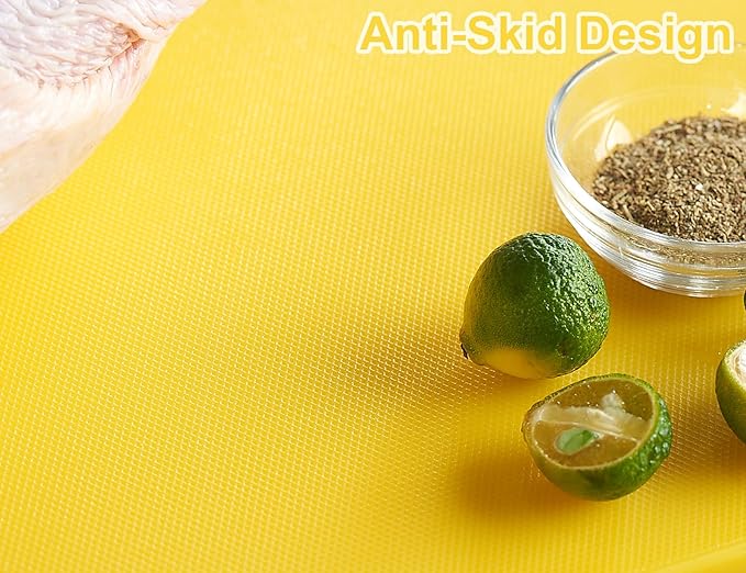 - 20 inch x 14 inch x 1/2 inch - This size is ideal for preparing large meals and provides you with enough space to hold various ingredients simultaneously. This yellow poly cutting board is perfect for slicing raw chicken & poultry and seasoning it with condiments.
