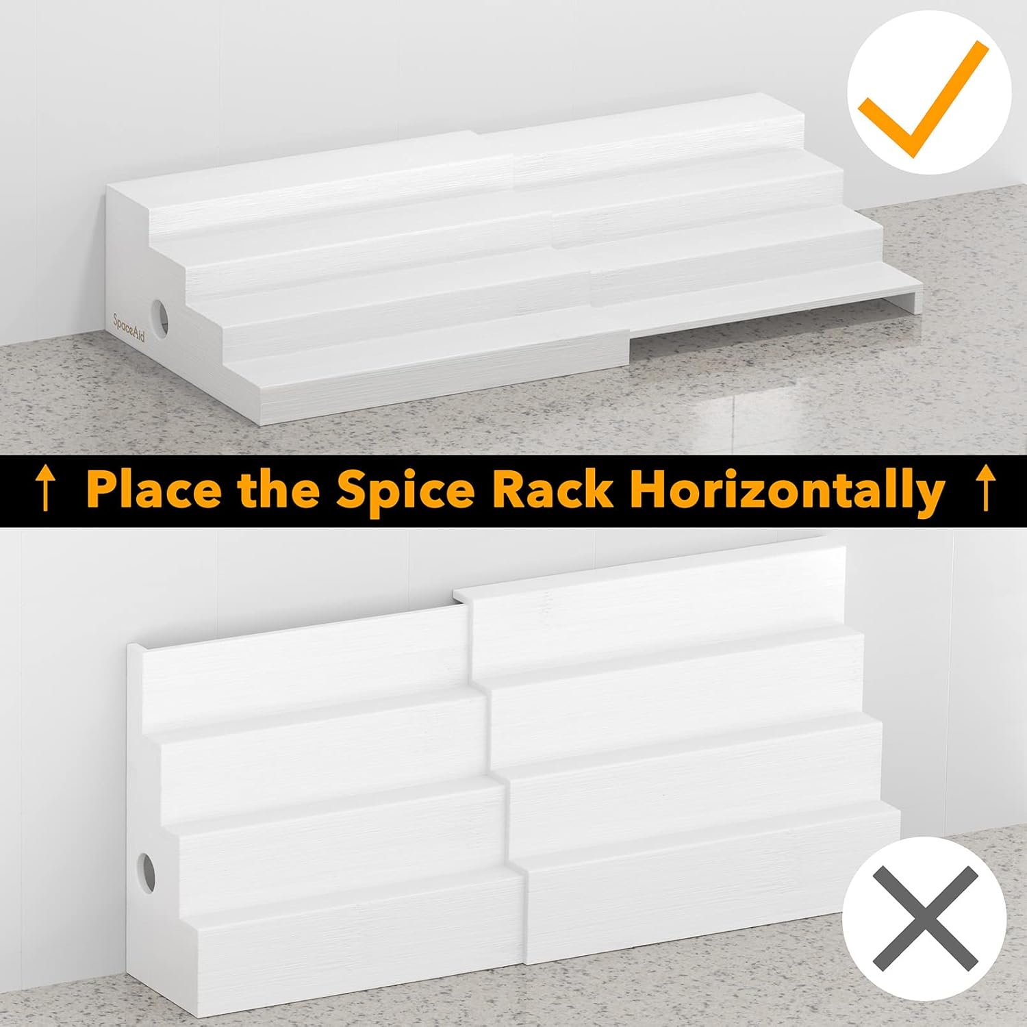 - ORGANIZED AND BEAUTIFUL - Make your kitchen cabinet neat and organized with bamboo spice rack organizer; PLEASE place the spice organizer horizontally; NOT vertically; SIZE: (12"-22")W x 9.5"D x 4.5"H