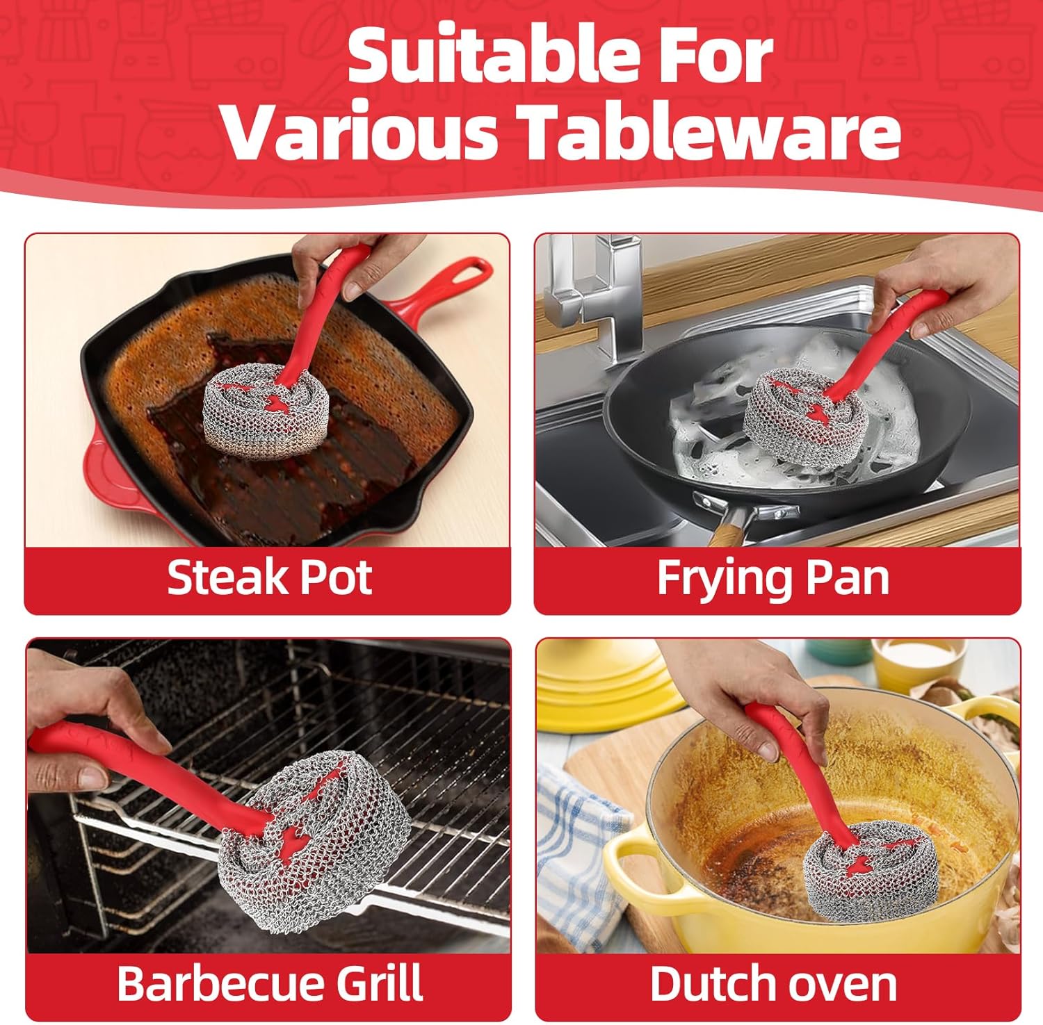 - ERGONOMIC DESIGN - 4 in 1 pattern and all rings welded closed with other rings, what means the chainmail scrubber willl never fall apart in daily use. The handle design for a better grip, these cleaners keep your hands away from the chain mail leading to less fatigue. The easy on the hands, flexible chainmail scrubber gets into any corner or crevice and is suitable for all cookware: pots, pans, grills, griddles, even BBQ mesh.