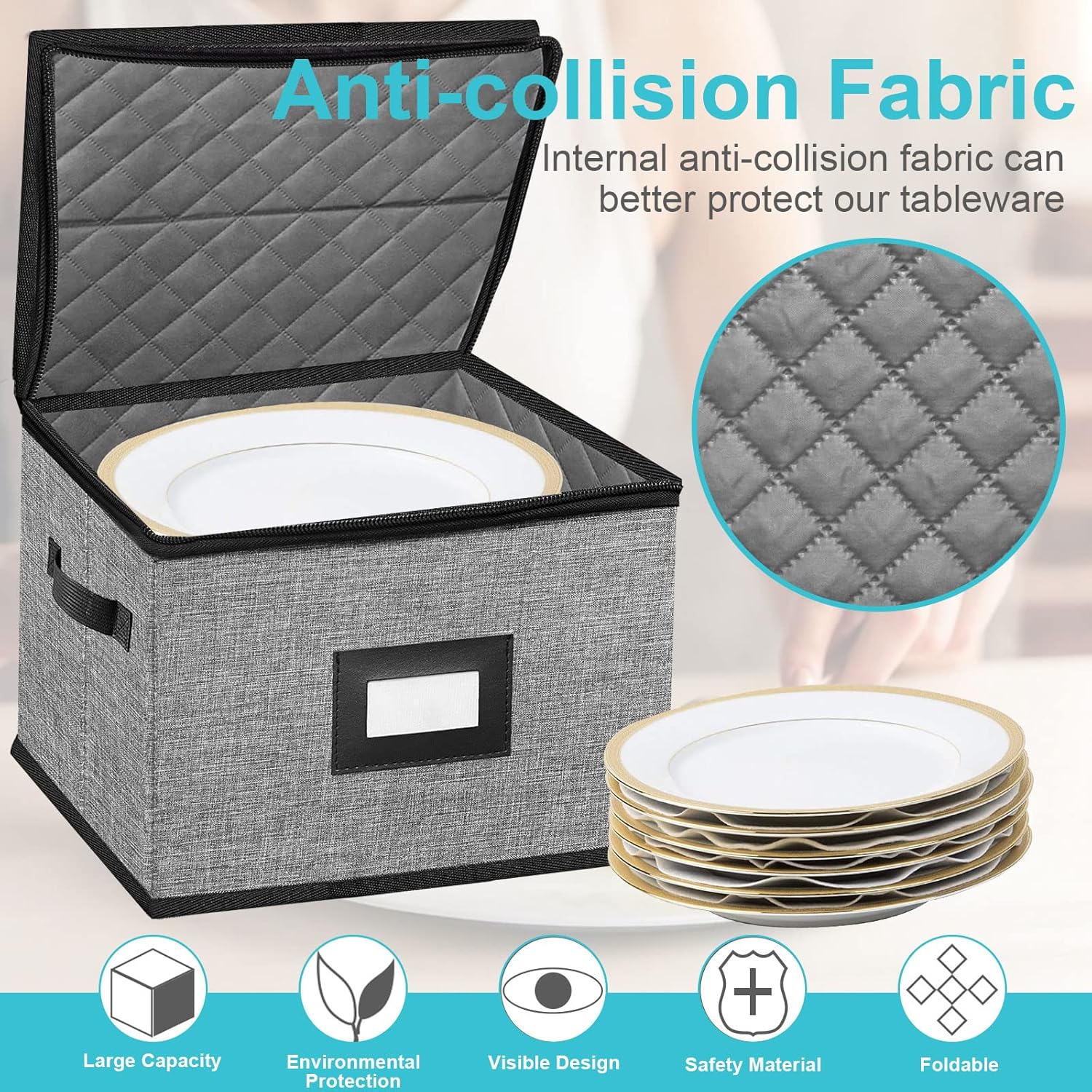 China Storage Containers-Quilted Dish Storage Containers with Lid Hard Shell for Moving Transport, Dinnerware Storage,Stackable Plate Storage,24 Felt Plate Dividers Included,2PACK 12*12*8in(Dark Grey)