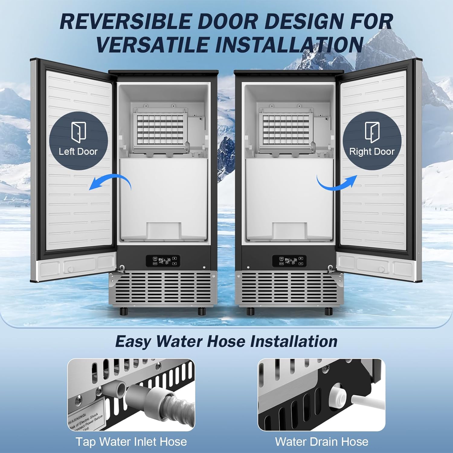 - 【Universal Design Flexibility】:Designed to fit seamlessly into any space, this standalone ice maker can be placed under the counter or used as a freestanding unit. The reversible door adapts to left or right opening preferences, ensuring a harmonious fit with your kitchen or bar setup. The adjustable feet provide stability on uneven surfaces, making it the perfect ice-making addition wherever you need it