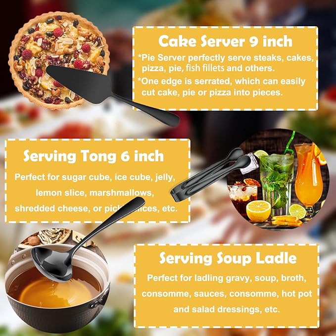- 【Multiple Applications】The slotted spoons, solid spoons and forks can removed different food in the liquid or with a thick sauce. Pie Server perfectly serve steaks, pizza, pie and others. The other 6 inch small tongs are suitable for serving sugar cube, ice cube, jelly, etc.