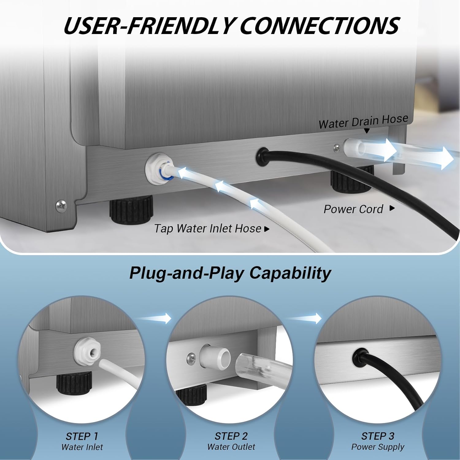- 𝗦𝗜𝗠𝗣𝗟𝗘 𝗖𝗢𝗡𝗡𝗘𝗖𝗧𝗜𝗢𝗡 𝗣𝗥𝗢𝗖𝗘𝗦𝗦 - This commercial ice maker machine comes with a full set of accessories including a water inlet hose, drain hose, water quick connector, premium water filter and ice shovel. You just need to connect the inlet and the drain hoses, and it will automatically fill and drain the water. And then start the cycle of ice-making