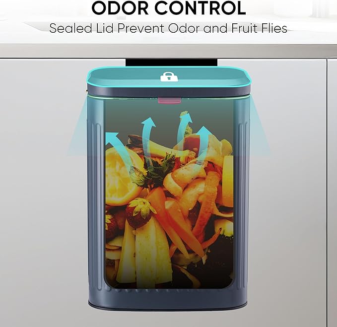- [Waste Basket with Fully Sealed Base and Lid] The compost can's base is fully sealed, there is no trash with leak from the base.After covered the lid, the trash odor will not enter into the air.Keep the odor inside in the trash bin effectively.