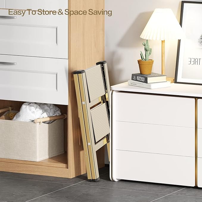 GameGem 2 Step Ladder, Aluminum Folding Step Stool with Anti-Slip Sturdy and Wide Pedal, Lightweight Portable Multi-Use Stepladder for Home and Kitchen Use Space Saving, Gold, 330 lbs