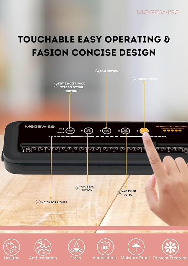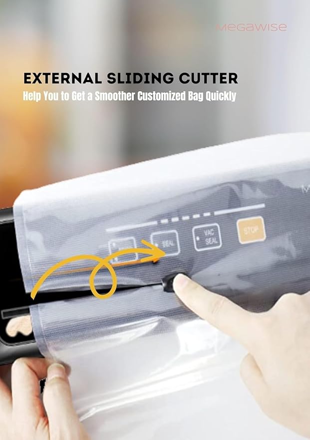 - Mega Powerđź’• Save Your Energy: Effortlessly preserve your food! With its 80kPa powerful suction and high-grade heating wire, our MegaWise vacuum food sealer delivers an optimum vacuum seal in just 10-20 seconds. Keep your food fresh up to 5 times longer, and avoid wasting meals by throwing them in the trash due to ice crystal buildup in the fridge.
