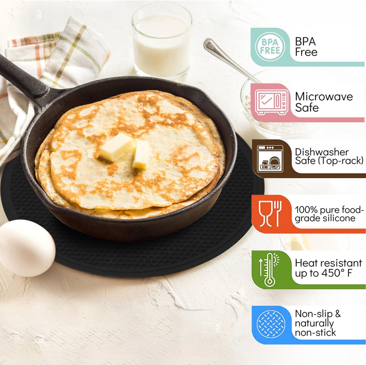 - 🥘【BETTER CIRCULATION】: Our microwave mat has 2mm anti-slip Texture that helps dissipate heat faster. Features raised edge to help effortlessly lift hot bowls and plates while protecting from heat. These silicone trivet mats are heat protection and insulated as a protector for countertops. Heat-resistant temperature from -40°F-446°F(-40°C to 230°C), safe for use in the oven, freezer, microwave, and as a pot holder, trivet, jar opener, spoon rest or anywhere you need extra grip or extreme heat.