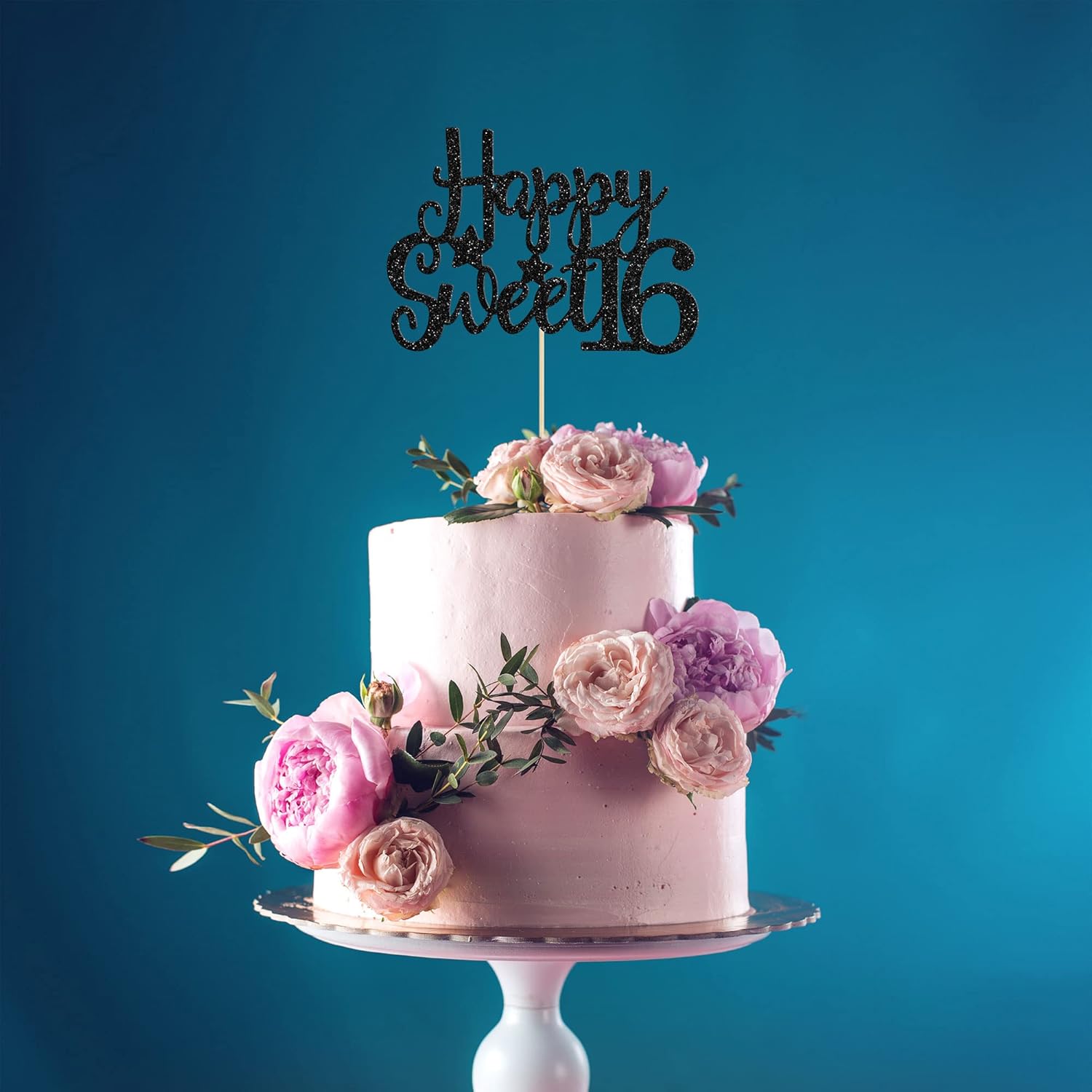 Gyufise 1Pc Happy Sweet 16 Cake Topper Glitter 16th Birthday Cake Pick for Cheers to 16 Years Old 16th Birthday Party Cake Decorations Supplies Black