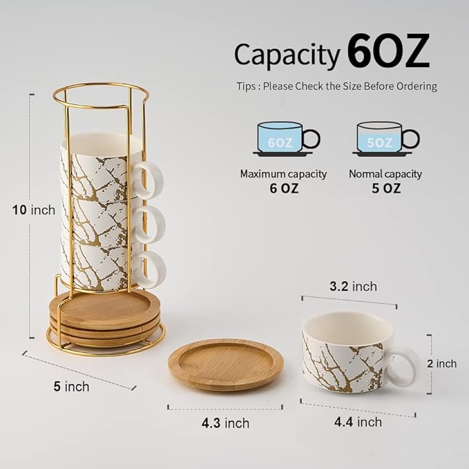 LUKA Porcelain Espresso Cup with Metal Stand, 6 Ounce Stackable Ceramic Demitasse Espresso Mugs Cappuccino Cups Set for Latte,Coffee,Cafe Mocha,Tea(Set of 4,White)