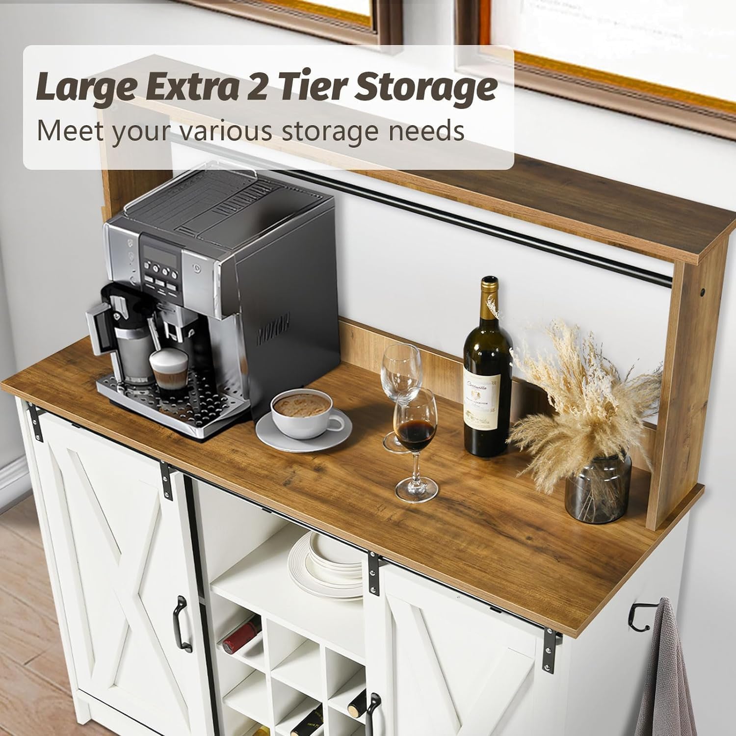 4ever2buy Farmhouse Coffee Bar Cabinet with Hutch, 47 Inch Buffet Cabinet with Storage, White Wine Bar with 9 Wine Racks and 6 Hooks, Coffee Bar Table with Adjustable Shelves for Living Dining Room