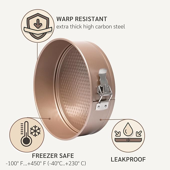 - π Truly Nonstick for Easy Release β the superb nonstick coating guarantees quick and easy release of baked goods, making it simple to remove your cheesecake or cake without sticking. The springform design is easy to open and close for a picture-perfect result!