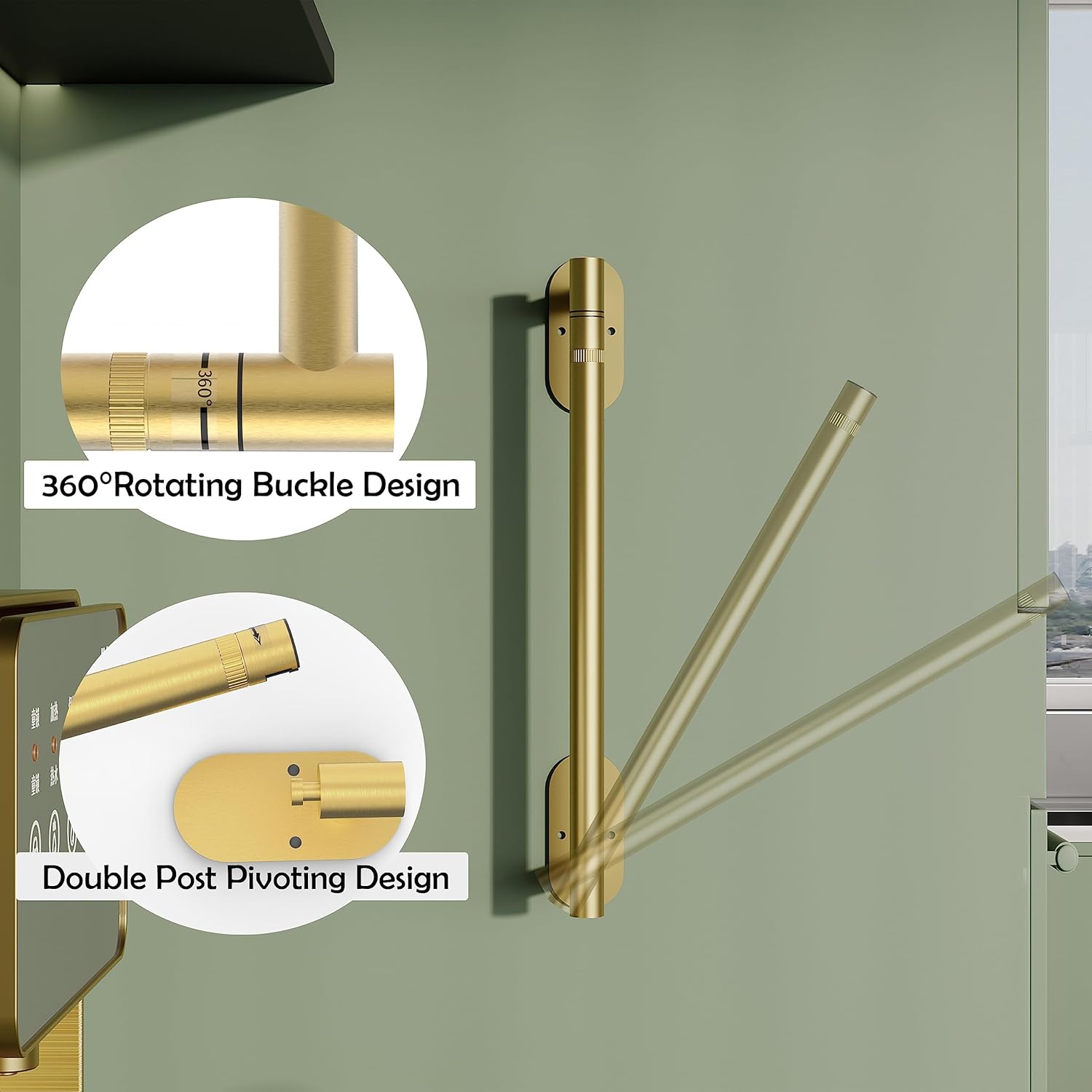 Ruacq Brushed Gold Paper Towel Holder Double Post Pivoting Round Base Under Cabinet Paper Towel Holder for Kitchen Self-Adhesive or Drill mounting