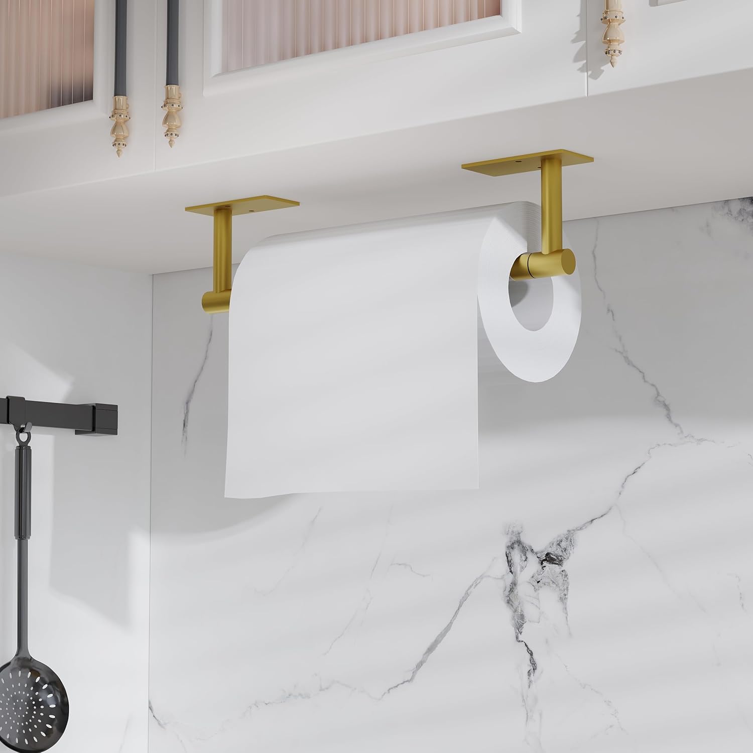 Ruacq Brushed Gold Paper Towel Holder Double Post Pivoting Square Base Under Cabinet Paper Towel Holder for Kitchen Self-Adhesive or Drill mounting