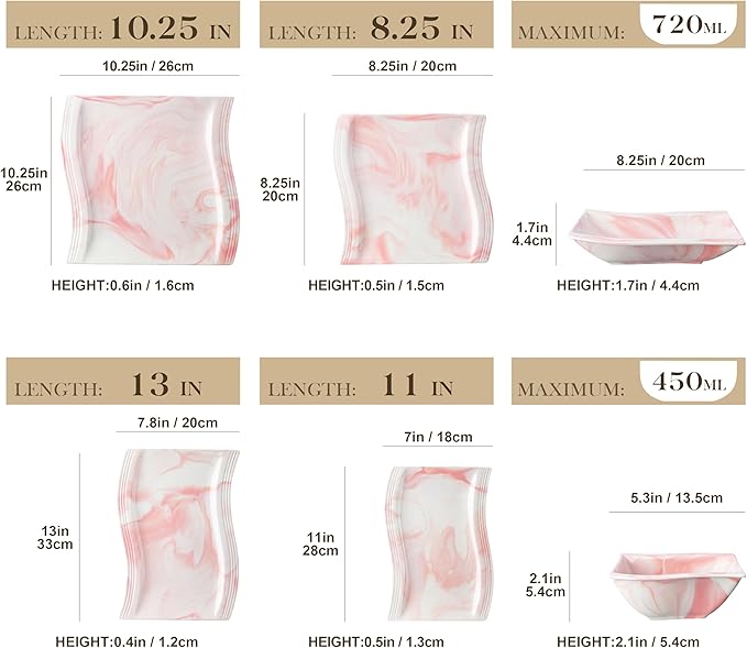 - Stylish and Low Maintenance - Featured with low-profile wavy-shaped square design, each plates and bowls sets are distinct; The pink dinnerware set is designed to provide the best dining experience while requesting low maintenance, saves you time and effort in upkeep