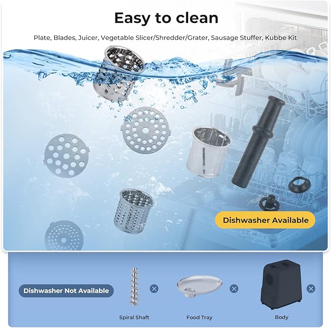 - Easy to Use & Clean: You could turn on the mince meat machine with only 1 button and start to grind meat. Also, all accessories can be removed separately for cleaning. Stainless steel blade and plates are dishwasher safe