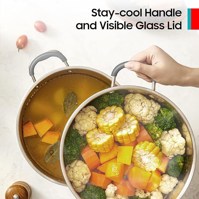 - Visualised Lid & Handle Design - The unique design of handles on both sides allows you to use them more comfortably and prevent burns. The transparent glass lid will let you know the cooking schedule and lock the food's flavour, heat and moisture. In addition, It has "L" measurement lines on the inside of the pot