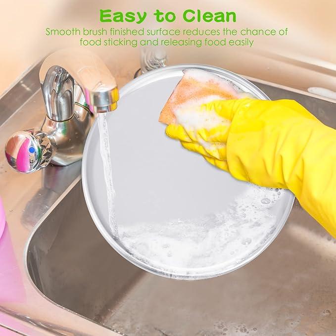 - Easy to Clean: these aluminum pizza pans smooth brush finished surface reduces the chance of food sticking and releasing food easily, provides convenience to clean up, easy to clean even by hand, make sure to dry the baking pans completely after washing and store in dry place for their durability