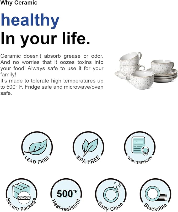 - Sleek And Easy To Clean: Use heat-safe ceramic & grade A porcelain, which is approve without lead, and Non-Toxic. The sleek ceramic glaze makes it easy to clean the cafe stains. Dishwasher safe