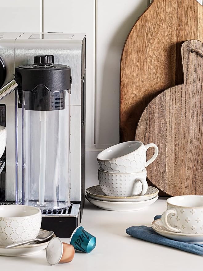 - Four Different Pattern Design: The outside of the cups are embossment which have four styles. The inner glaze is a smooth ceramic surface. . New homeowners will like the timeless farmhouse look of these bowls.Enough space for a coffee spoon and biscuit while enjoying a cup of lungo coffee