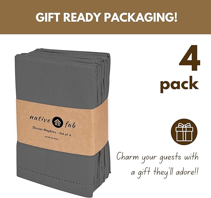 Native Fab Grey Cloth Napkins, Set of 4, 100% Cotton, Hemstitched Mitered Edges 18x18 inch, Soft, Durable, Absorbent, Washable, Hotel Linen Quality - Events, Lunch, Party, Dinner Napkins - Gray