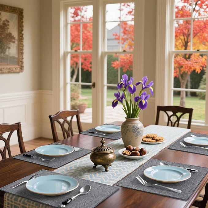 - √ MATERIALS: Our placemats are made of linen and cotton, durability and washable, liquid can go through placemats, anti-heat and anti-stain, protecting your table from all kinds of debris and stains